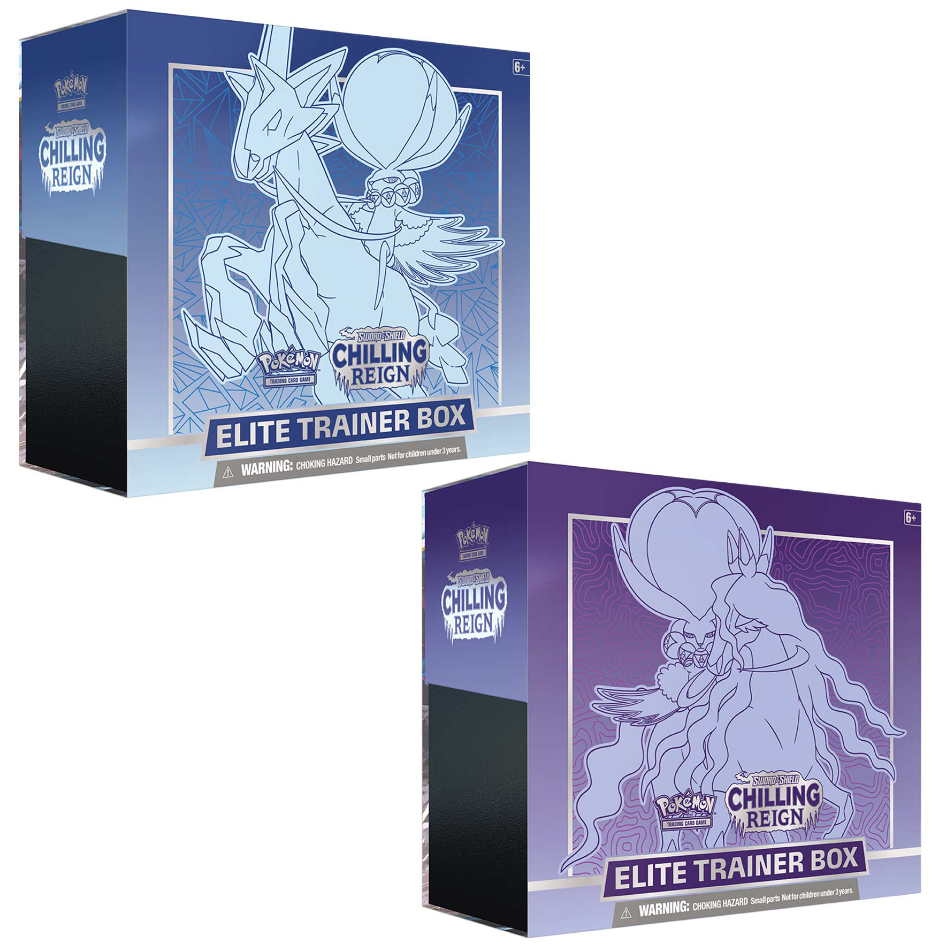 The Chilling Reign Elite Trainer Box – Ice Rider Calyrex includes booster packs and themed accessories inspired by this legendary Pokémon.