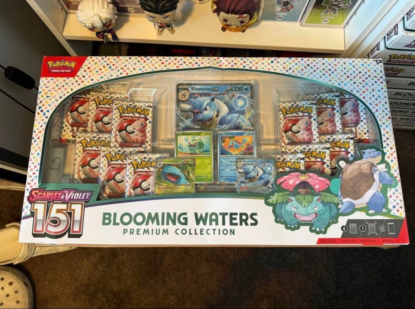 The Blooming Waters Premium Collection is a special Pokémon TCG set featuring exclusive cards, booster packs, and themed collector items. This premium release is highly desirable among collectors.
