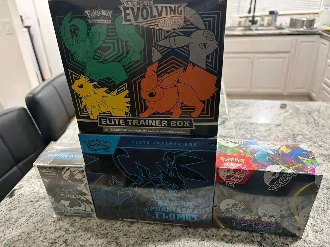 The Evolving Skies Elite Trainer Box (ETB) includes booster packs and useful gameplay accessories designed for Pokémon TCG players and collectors.