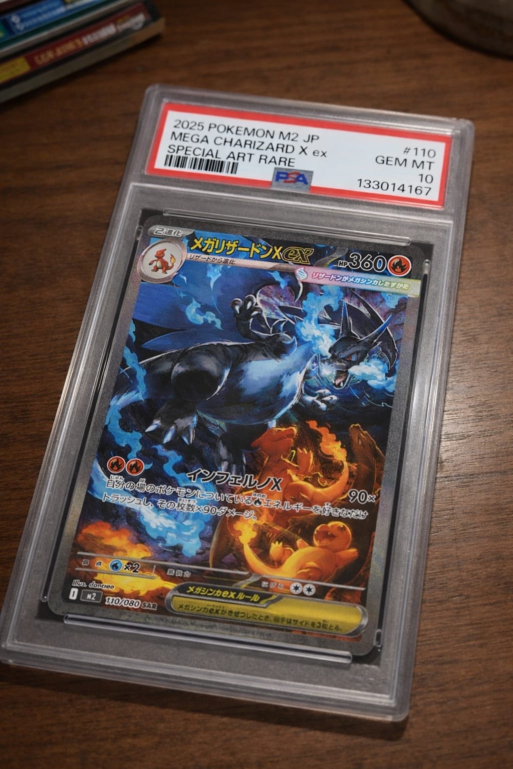 The PSA 10 Mega Charizard X ex SAR is a premium graded Pokémon card featuring the iconic Mega Charizard X in stunning Special Art Rare (SAR) form. Professionally graded Gem Mint 10 by PSA, this card is highly sought after by collectors for its condition, rarity, and incredible artwork.